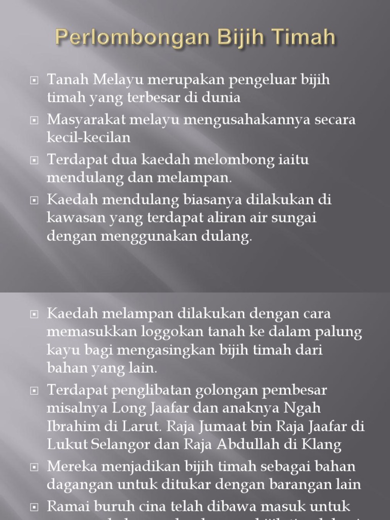 Arti kata mendulang adalah melimbang emas intan atau bijih dengan dulang. Abad Ke-19 Sultan Ahmad memberikan konsesi kepada orang Eropah untuk memajukan kegiatan Pelombong Eropah menggunakan kaedah lombong dedah dan lombong. Xdocs Tips from Slide tersebut merupakan projek sejarah saya bagi tingkatan 3 yang bertajuk kegunaan dan kepentingan bijih timah di tanah melayu.